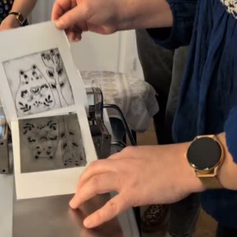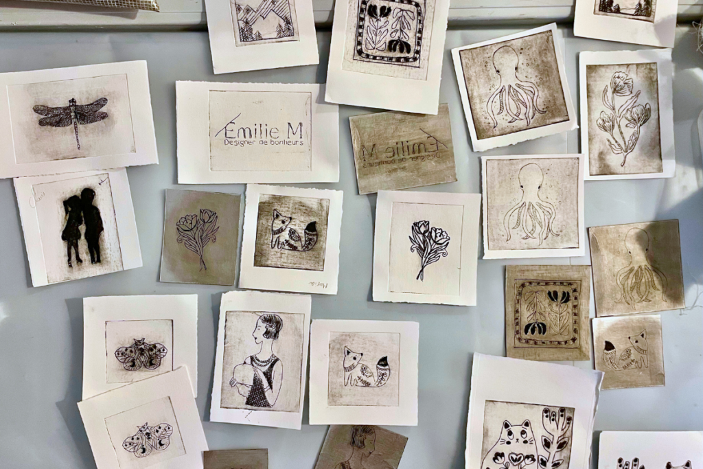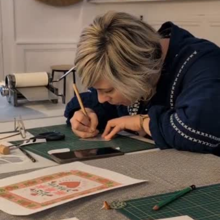 Elle développe ses motifs à partir du dessin et de la gravure, nourris par l’aléatoire, la nature et un travail de composition numérique.
