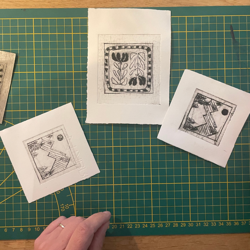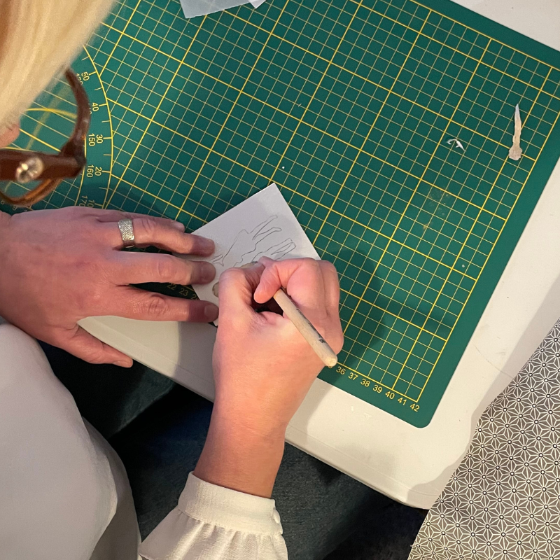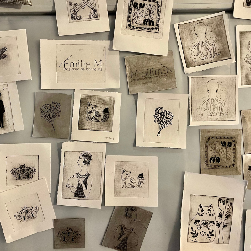 Elle développe ses motifs à partir du dessin et de la gravure, nourris par l’aléatoire, la nature et un travail de composition numérique.